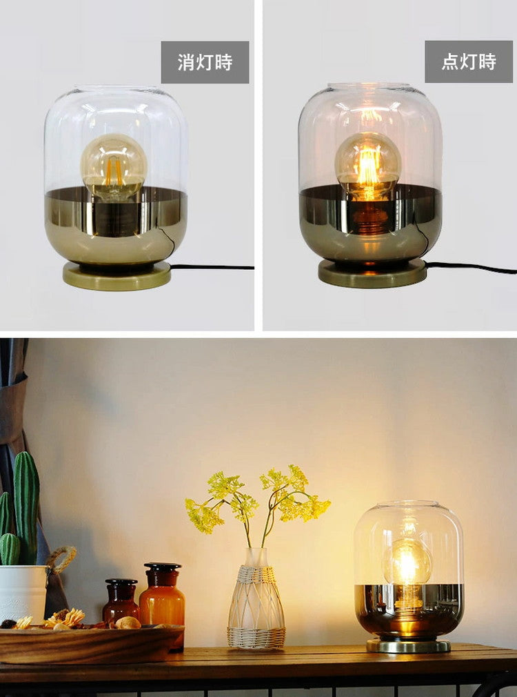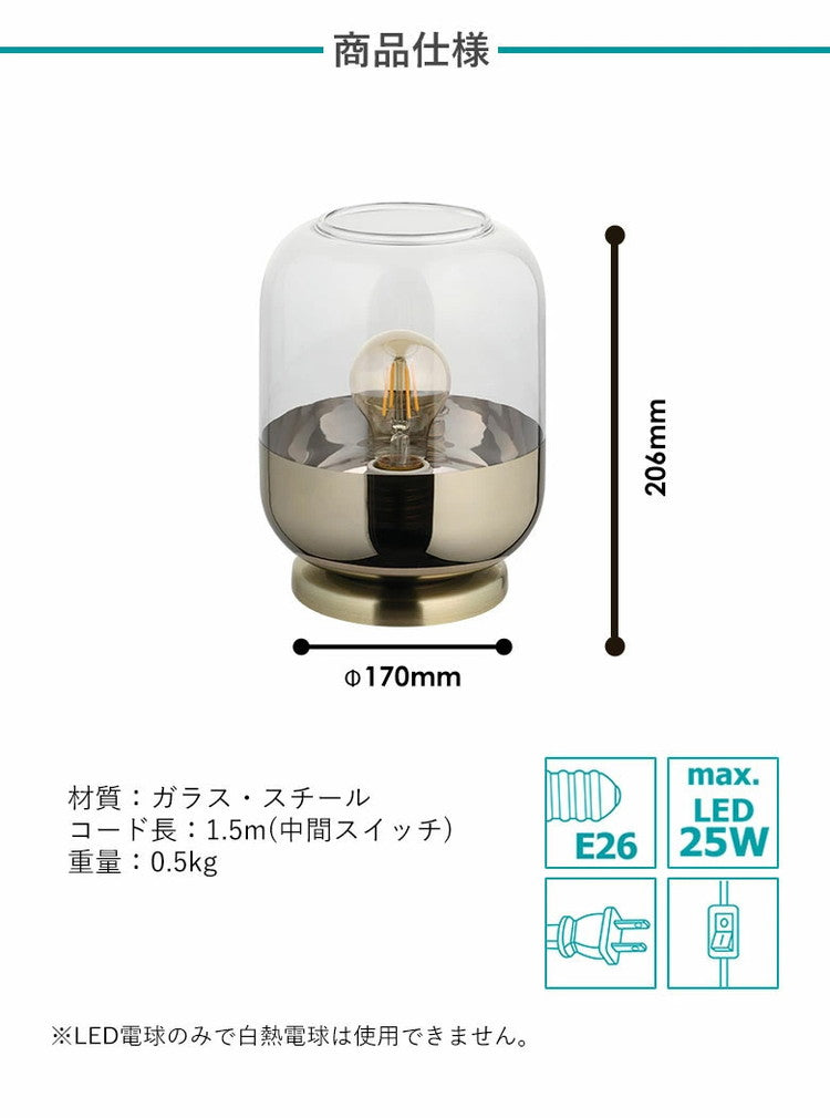 どんぐりのような円形のガラスシェードの下部・土台にゴールドをあしらったかわいらしいテーブルランプです。