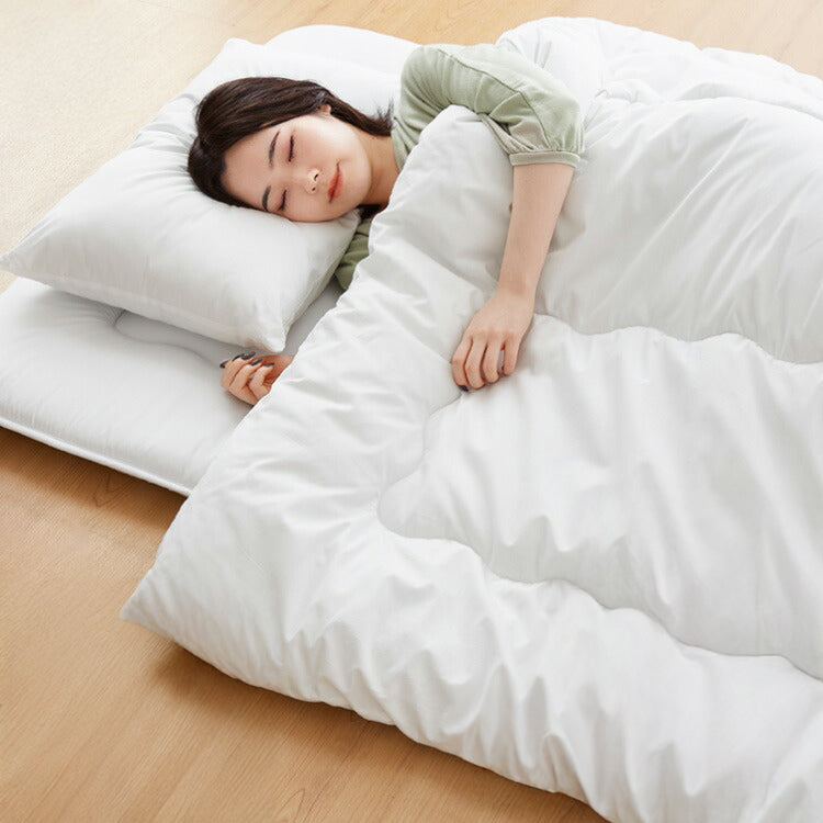 布団セット、4点セット、シングル、S、オーガニックコットン、コットン、綿、再生ポリエステル、リサイクル綿、3層構造、吸汗速乾、吸湿速乾、布団4点セット、布団、セット、ふとんセット、掛け布団、敷布団、敷き布団、敷きパッド、枕、まくら、ピロー、収納袋、プレゼント、ギフト、引っ越し、新生活、1人暮らし、リサイクル、エコ、省エネ、SDGs