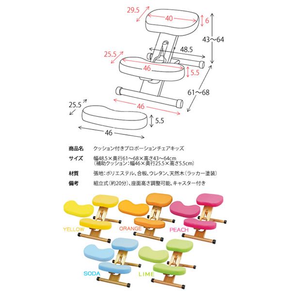 クッション付きプロポーションチェア/姿勢矯正椅子 【子供用 ピーチ】 木製(天然木) 座面高さ調整可/キャスター付き (代引不可)