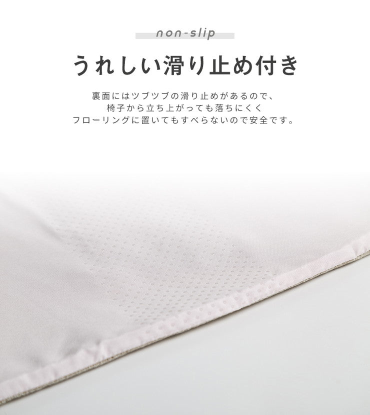 裏面には滑り止めが施されており、フローリングや椅子の上やズレにくい仕様です。