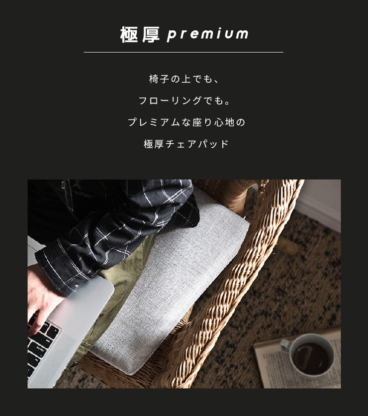 椅子やソファの上、シートクッションとしてフローリングや車でにも使えるプレミアムな座り心地の極厚チェアパッド。