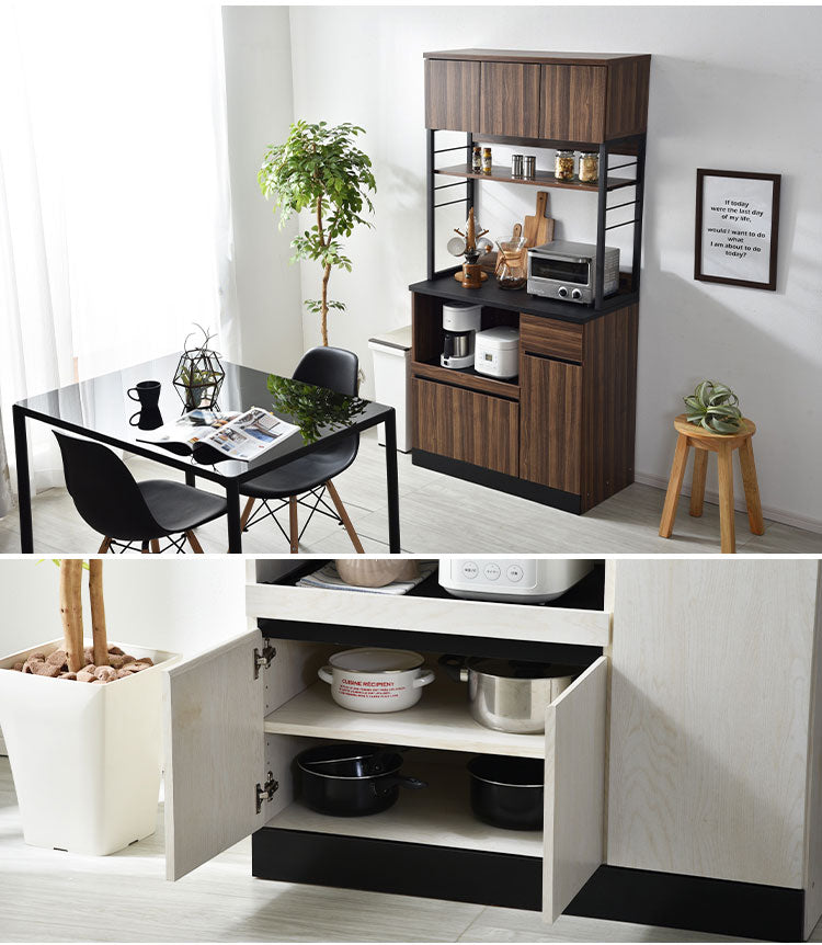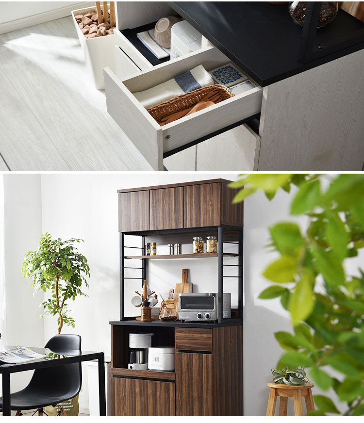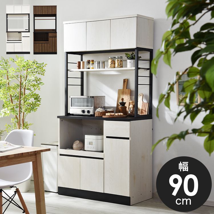 ウッドとスチールの食器棚 幅90cm 大型レンジ対応 キッチンボード キッチンキャビネット レンジ台 キッチン収納 スチールラック(代引不可)
